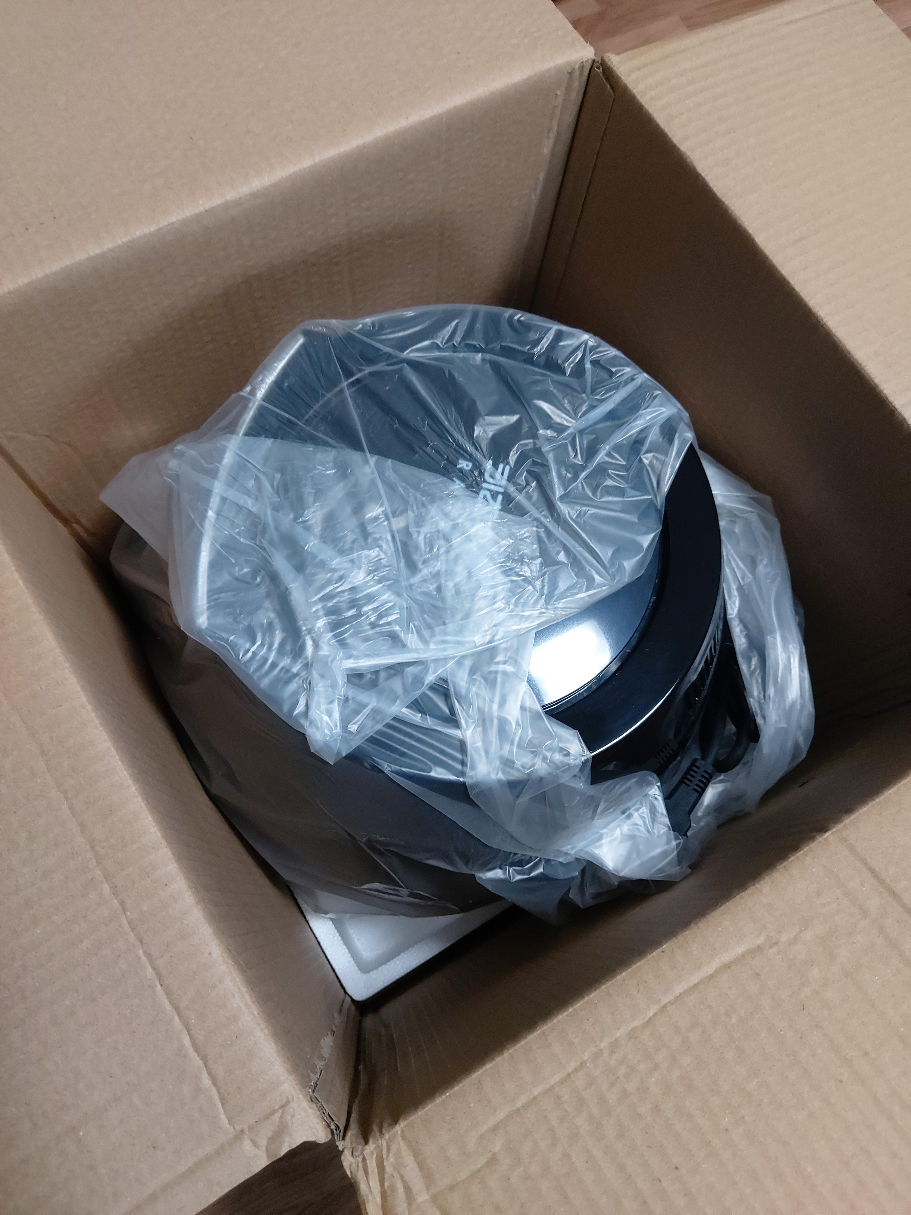 박스를 열고 찍은 사진입니다. 에어프라이어는 비닐로 포장되어 들어있구요. 아래에 스티로폼이 깔려있죠? 제품 위에도 스티로폼이 있어 위, 아래로 보호해주고 있었습니다.