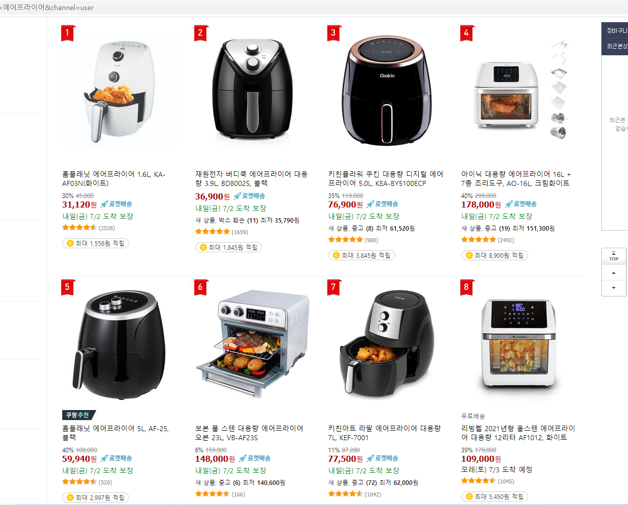 최종적으로는 5위와 7위 제품중 고민을 하다가 5L는 작지 않을까 싶어서 7L 에어프라이어 제품을 구매하게 된 것입니다. 제품을 받고보니 제가 생각했던 것보다도 용량이 작더군요. 그래서 5위 제품을 샀더라면 지금보다 만족감이 떨어졌을 것이라고 생각합니다. 키친아트 라팔 에어프라이어 7L 제품이 성능이 특별히 떨어지는 것도 아니고요. 뒤에 나오겠지만 조리 잘 되서 정말 맛있게 먹었습니다. 솔직히 처음에 깜짝 놀랐어요.