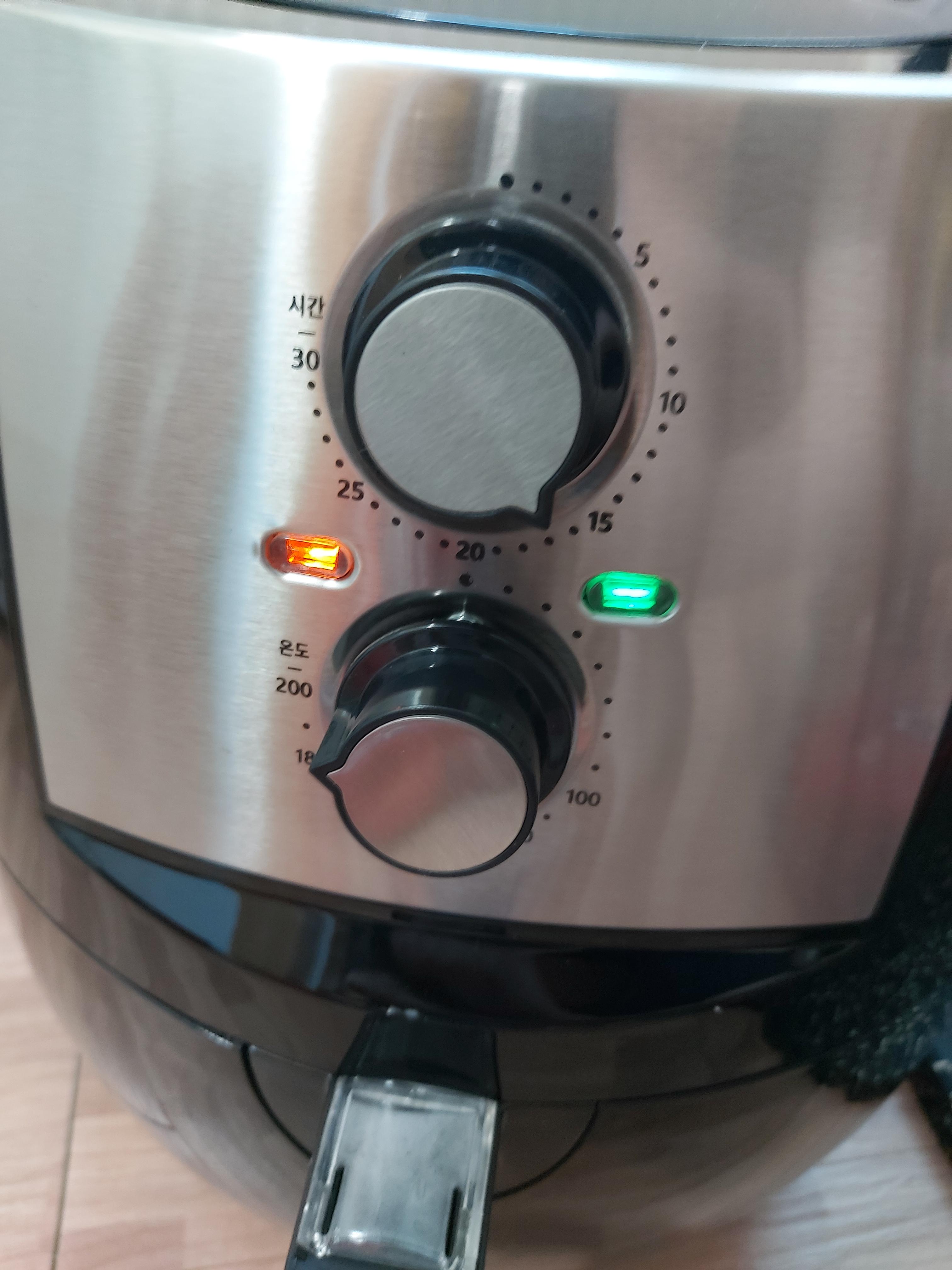 닭볶음용 닭정육을 조리중일 때 찍은 사진입니다. 시간 다이얼, 온도 다이얼이 있구요. 시간 다이얼은 최대 30분, 온도 다이얼은 최대 200도 까지 조절 가능합니다. 다이얼 아래에 있는 것은 손잡이입니다. 사진에 있는 플라스틱은 용기 분리 안전 캡이라고 하는데 손잡이를 잡은 상태에서 에어프라이어 방향으로 밀면 안전하게 분리할 수 있습니다.