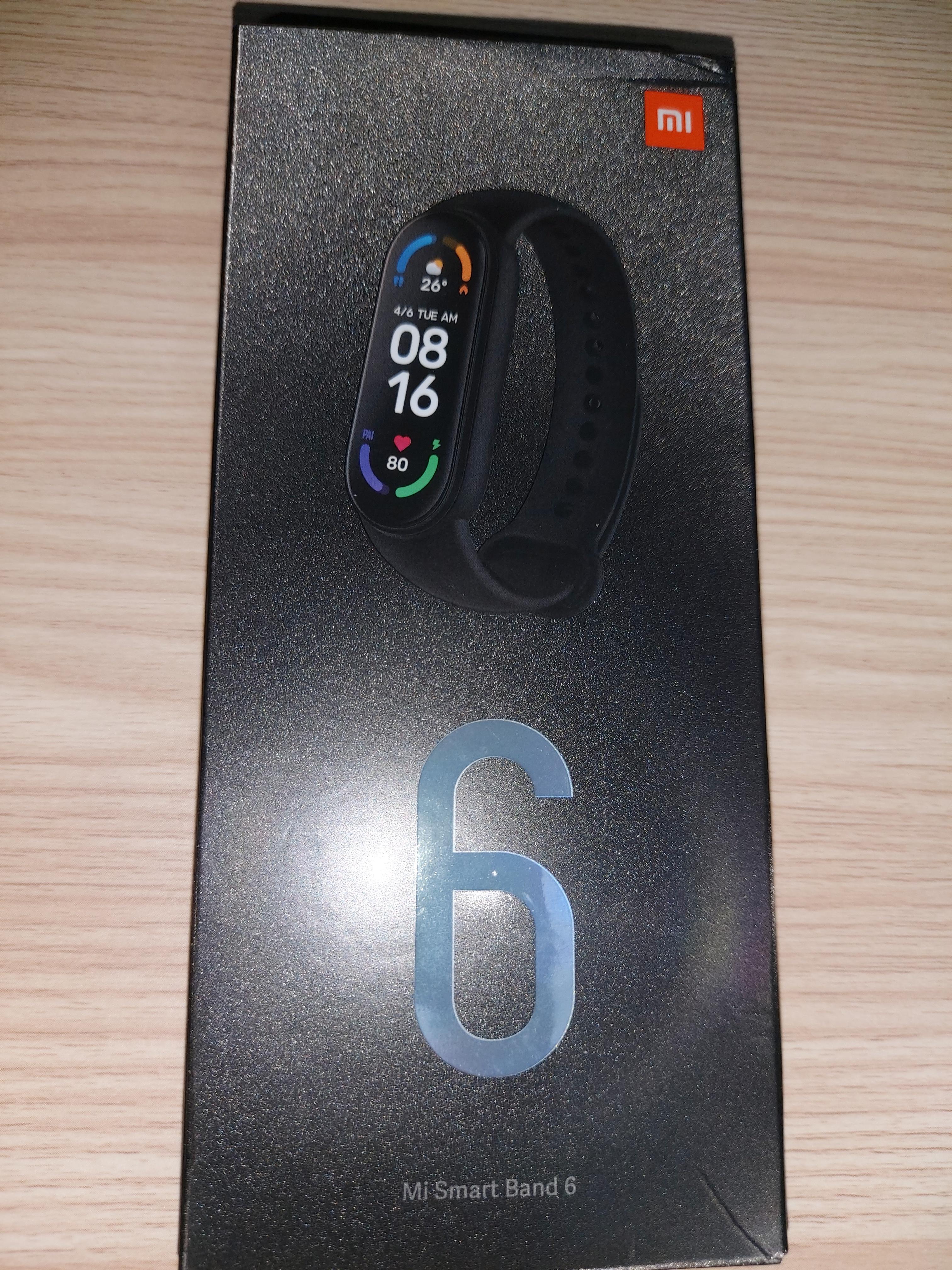 그럼 제가 직접 찍은 사진을 같이 볼게요. 먼저 박스 사진입니다. 박스 크기는 생각보다 작았구요. 위에는 미밴드6의 사진이, 아래에는 숫자 6이 적혀있습니다. 아래의 6은 각도에 따라서 색이 바뀌더라구요. 사진에서는 회색 비슷한데 실제로는 번쩍번쩍합니다.