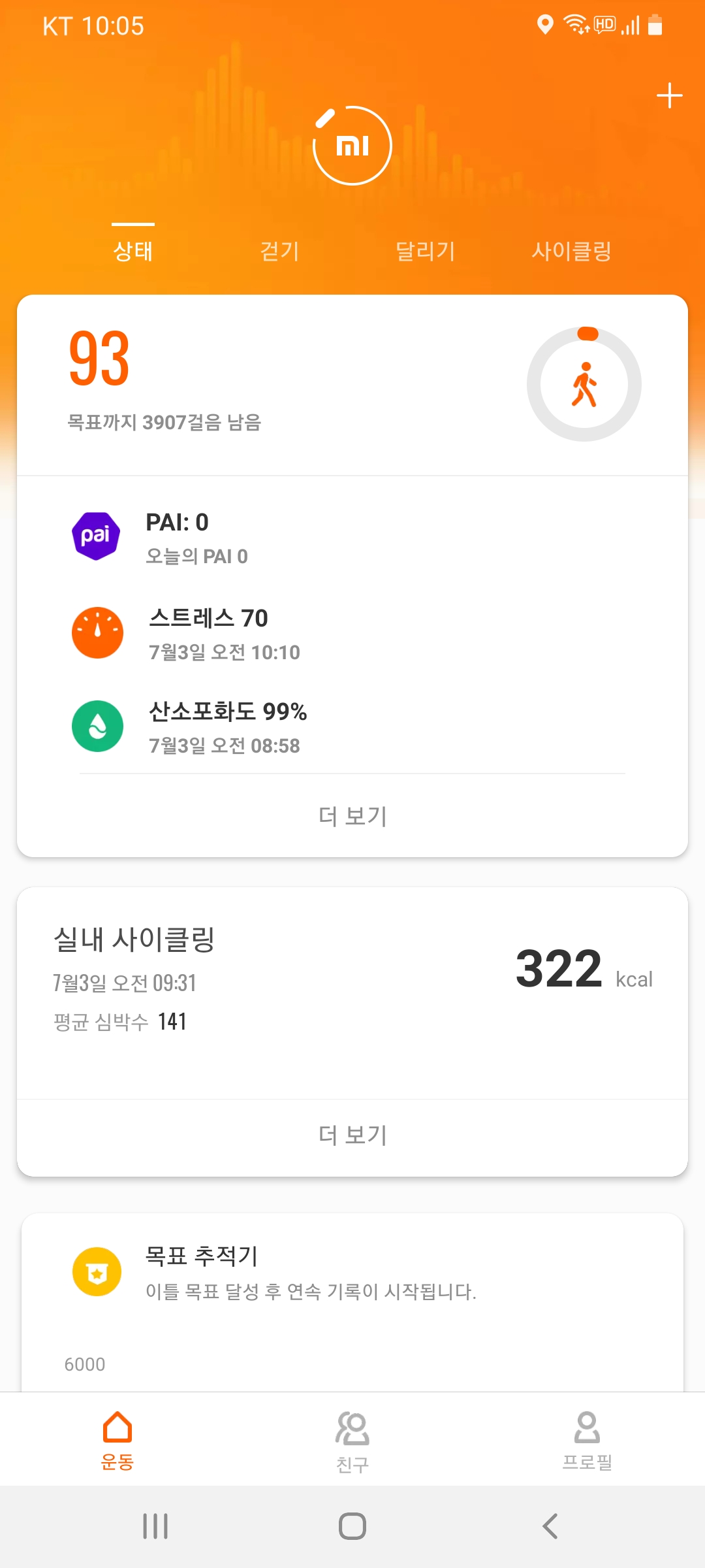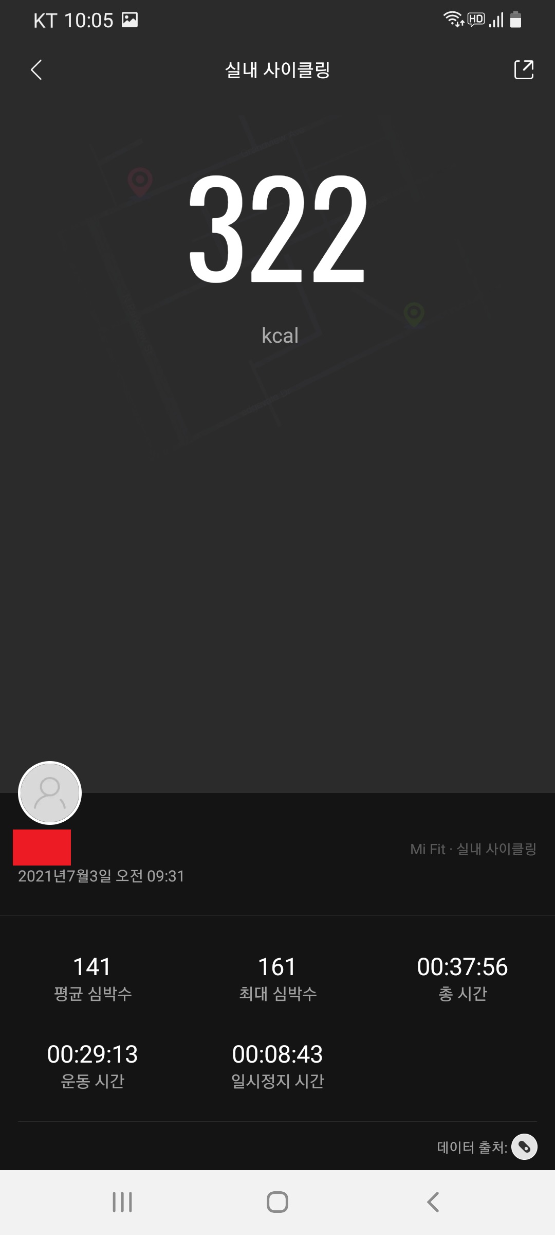 아래는 미밴드와 미핏이 연동된 후의 사진인데요. 기본적인 정보들을 한 눈에 볼 수 있습니다. 중앙 쯤에는 실내 사이클링이라는 메뉴가 있죠? 제가 사용한 운동 모드를 바로 연동해 띄워주었네요.
