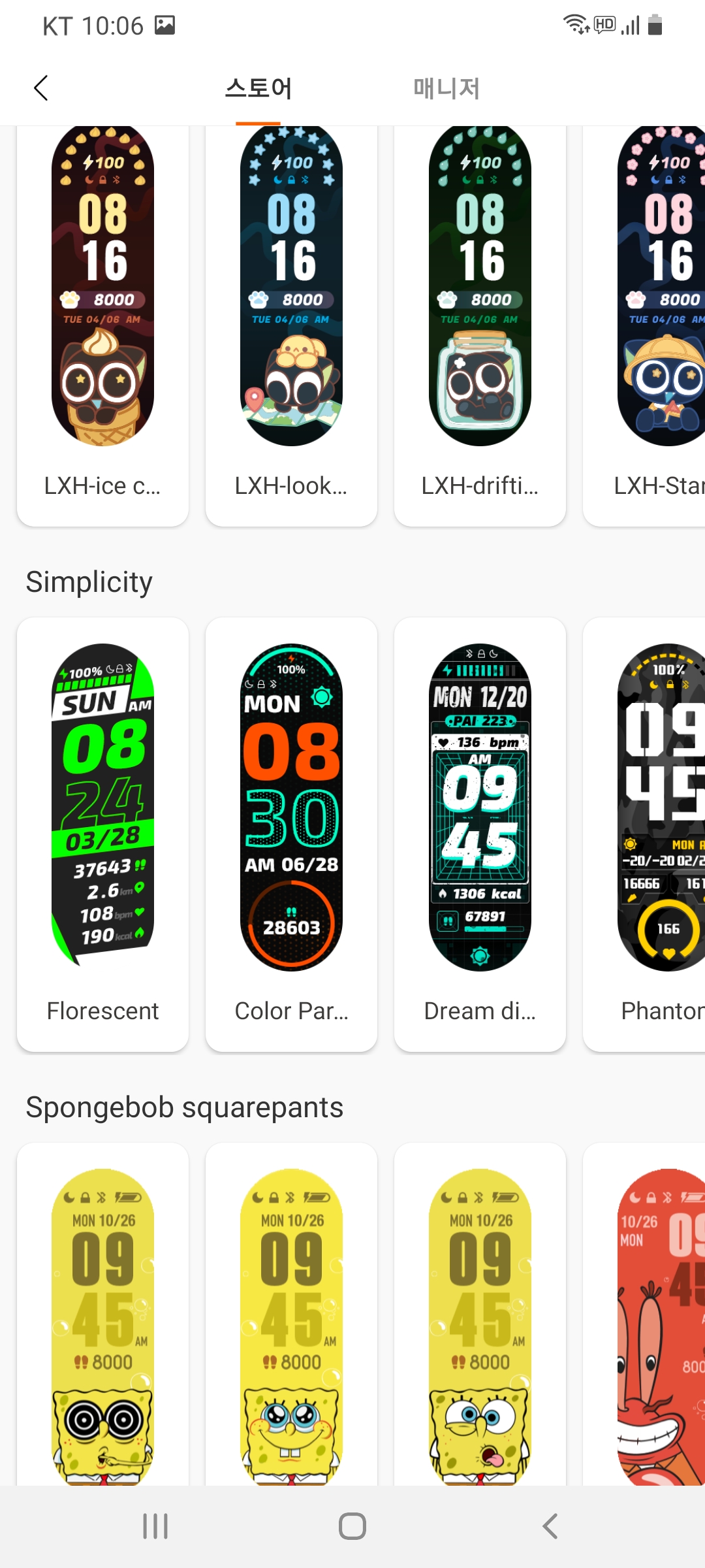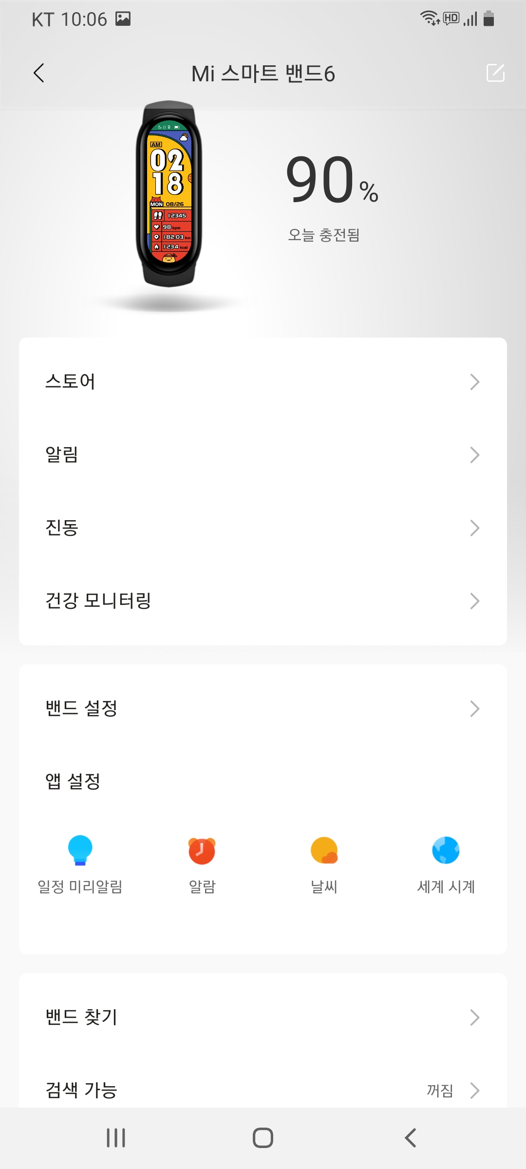 이외에도 미핏과 연동된 장치들을 앱에서 설정할 수 도 있는데요. 사진 상단에 미밴드6 화면 보이시죠? 스토어에서 마음에 드는 메인화면을 선택하여 제 미밴드6에 적용한 것이랍니다. 제 실제 미밴드가 저 테마를 사용하고 있어요.