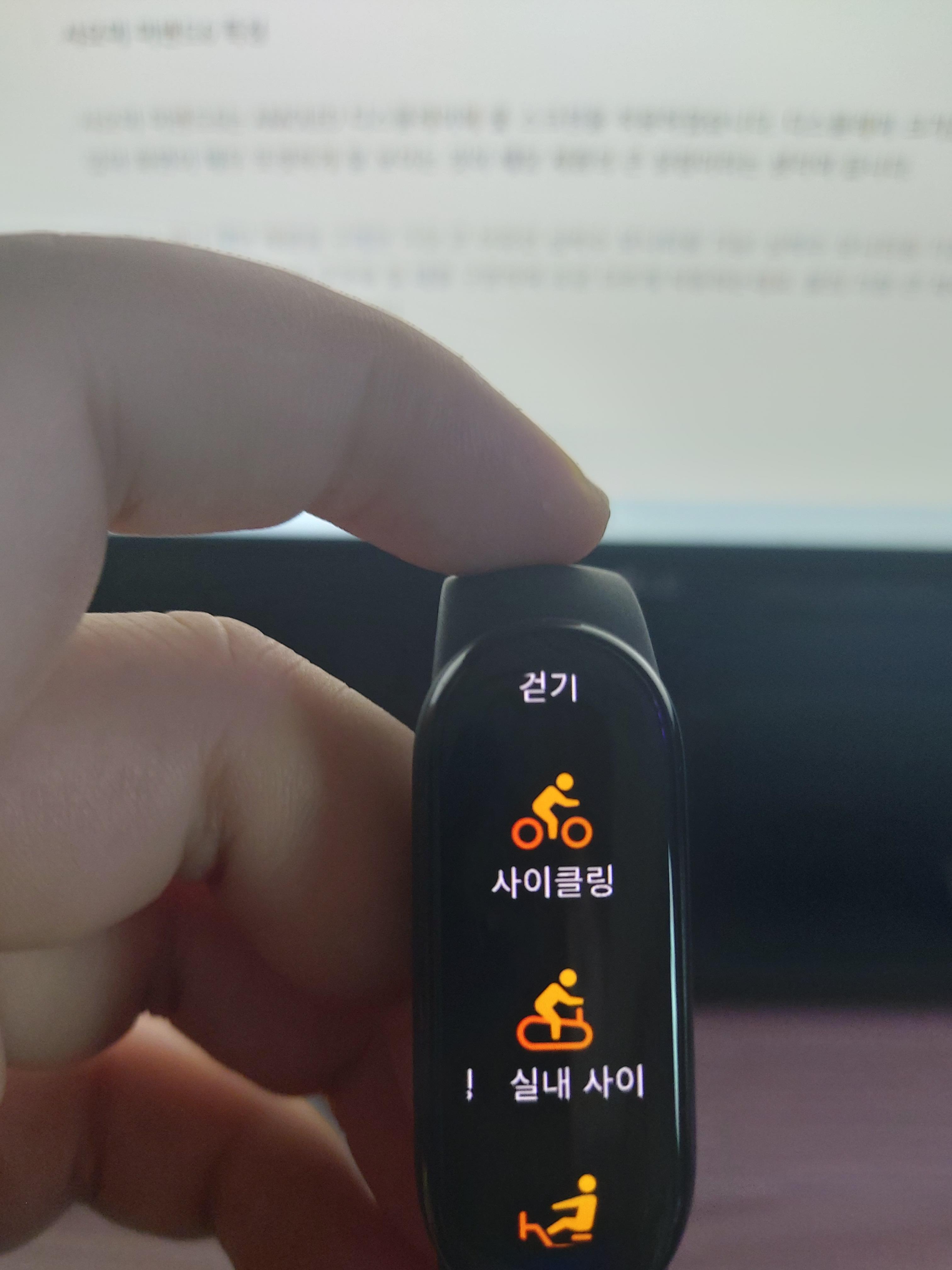 아래의 사진들은 제가 스피닝 자전거를 타면서 샤오미 미밴드6의 운동 모드를 사용한 후 찍은 것들인데요. 화면을 터치한 후 아래로 슬라이딩하면 미밴드의 다양한 기능들이 나오는데 그 중에서 운동 모드에서 찍은 사진들입니다.