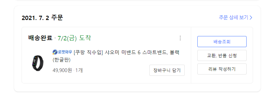로켓배송을 좋아하는 저는 쿠팡에서 구매를 하였는데요. 쿠팡에 들어가보니 미밴드6를 쿠팡에서 로켓와우로 직접 판매하더라고요.(지금은 로켓배송인듯) 쿠팡에서 직접 수입해서 판매하는 이 제품은 정식한글판이고 KC 인증을 받았으며, A/S가 가능한 제품이라고 합니다. 그러니 안살 이유가 없겠지요? 그걸 보자마자 바로 클릭!하여 구매하게 되었답니다. 배송이 어찌나 빠른지 오전에 구매했더니 그날 밤에 도착했습니다. 깜짝 놀랐어요. 요즘 깜짝 놀랄 일들이 많이 생기네요.