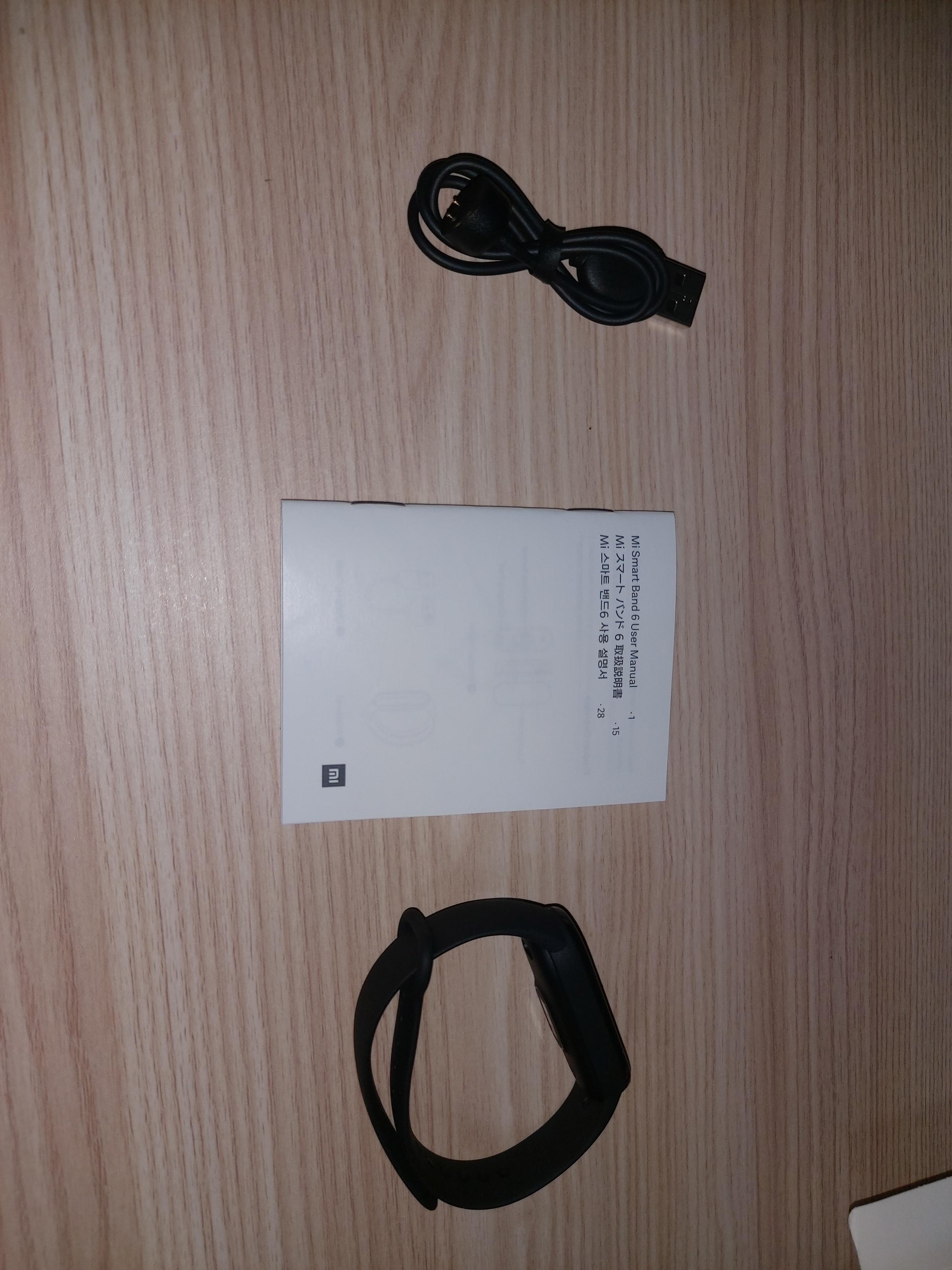 다음은 내용물입니다. 내용물은 크게 3가지로 충전 케이블, 사용 설명서, 샤오미 미밴드6 제품이 들어있습니다. 충전 케이블은 한쪽은 USB 포트가 달려있고 한쪽은 자석으로 되어있어 미밴드 본체 뒷면에 붙이시면 충전이 된답니다.
